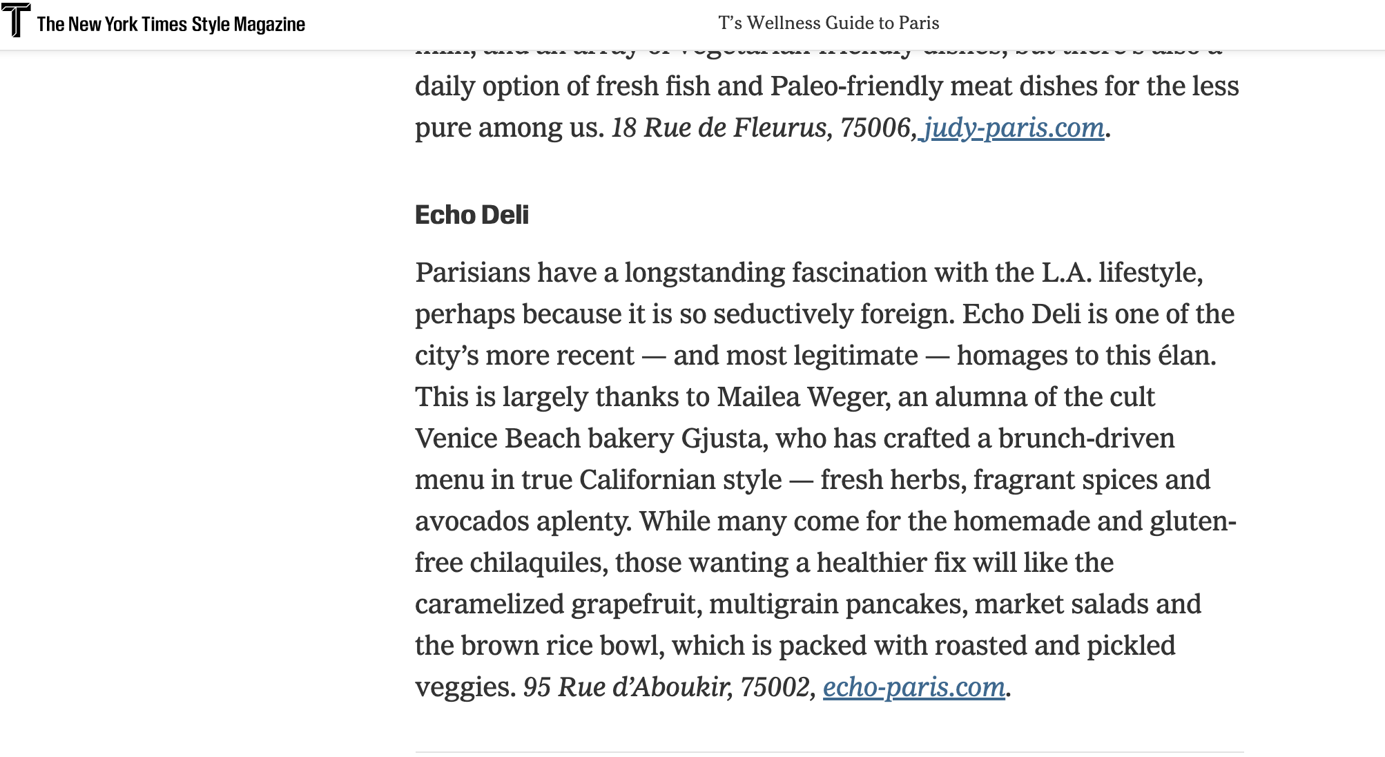 Silver Lake? Almost, but not quite. Echo is a “deli Californien” on Rue d’Aboukir, with food by Mailea Weger, an alumna of Gjusta and Gjelina in Los Angeles, and one of the latest signposts of the California dreaming that has seized Paris. New York Times